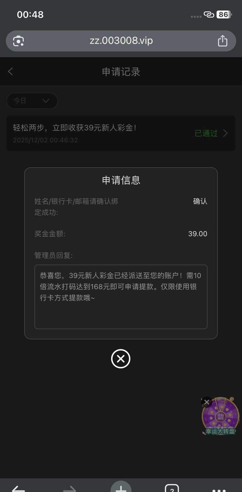 自助彩金39 注册先去安全中心绑定手机号跟邮箱 再绑定银行卡 然后去优惠先绑定邮箱 再申请 最低168提现 只可以银行卡